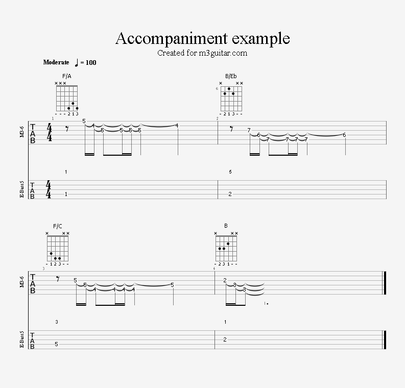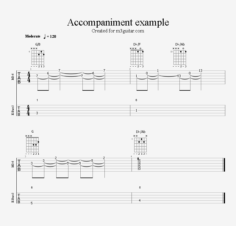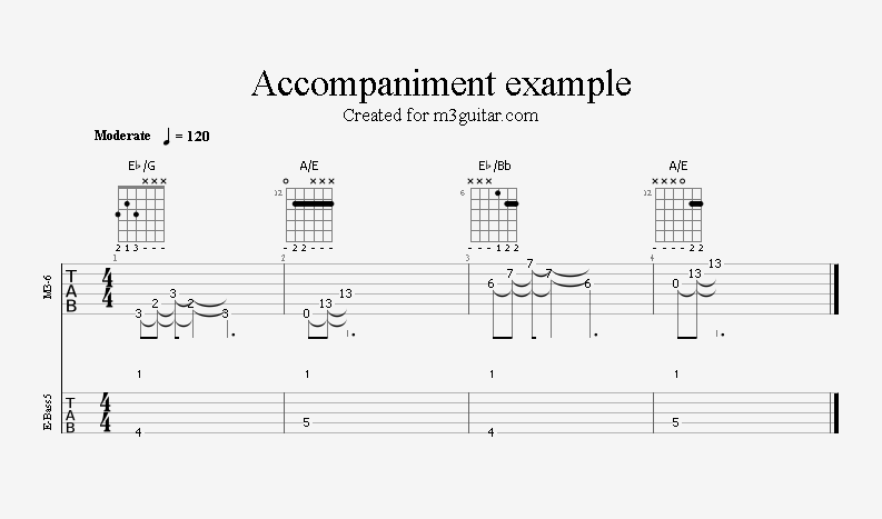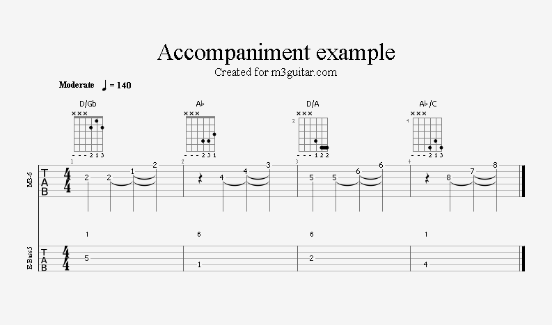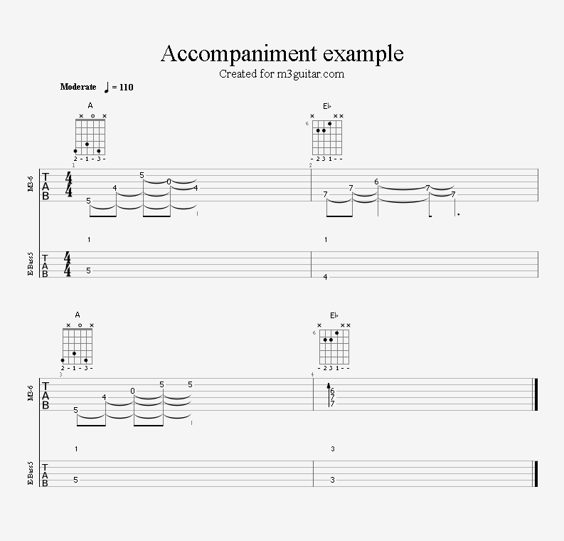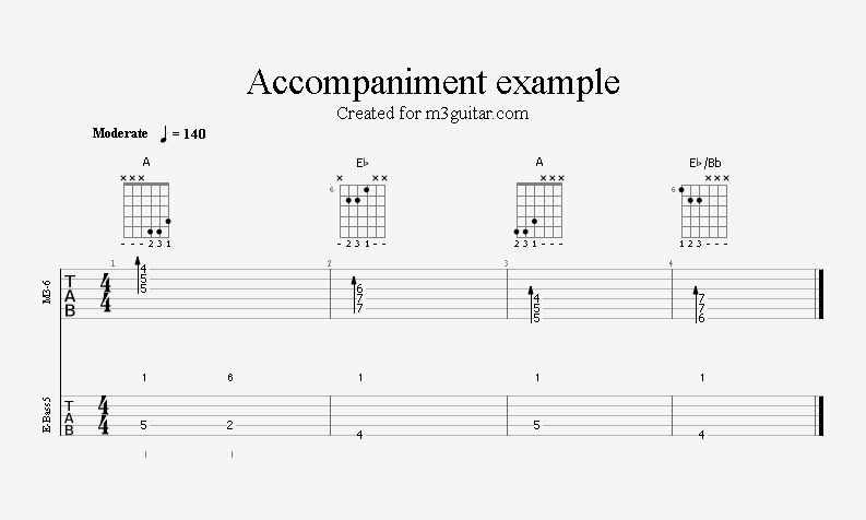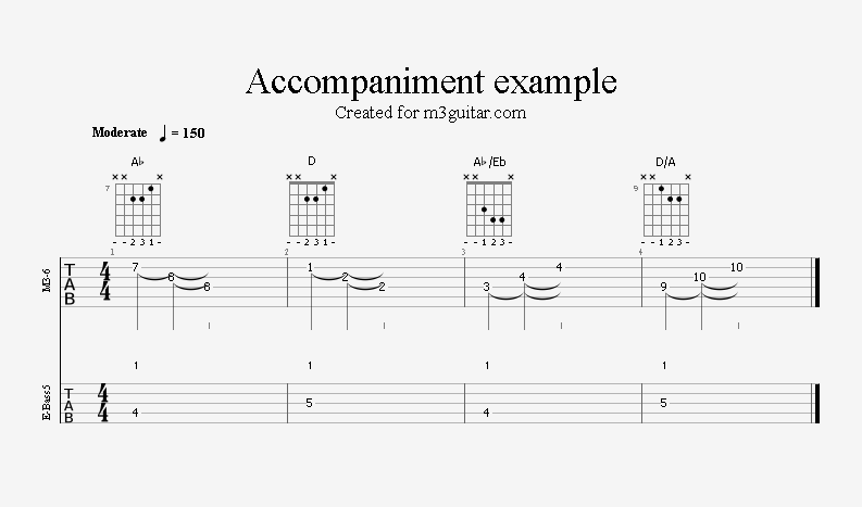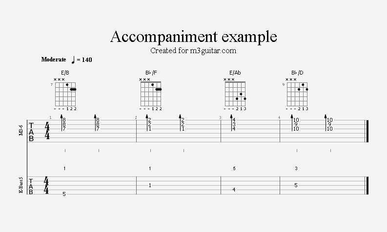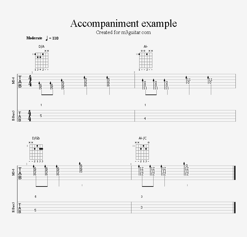 There are 24 examples, with two in each of the twelve keys. The examples are ordered in pairs since it does not make any difference whether the root movement goes up or down by six semitones, you end up on the same note. Each pair is denoted by a number corresponding to the starting key in clock notation. Thus, the first pair of examples, 1, starts in A (1 in clock notation), and moves up five semitones to D. A bass line is included, using notes from the triads (1-3-5) and occasionally the 6th, which makes a minor 7 sound. The function of each bass note is indicated as a number (1, 3, 5, or 6) above the staff. All examples are in 4/4 and consist of four bars, repeating the two chords once. Thus, the triads making up the 1 examples are A-Eb-A-Eb. All examples can be played with a pick only, without having to pluck the strings with the right hand fingers.