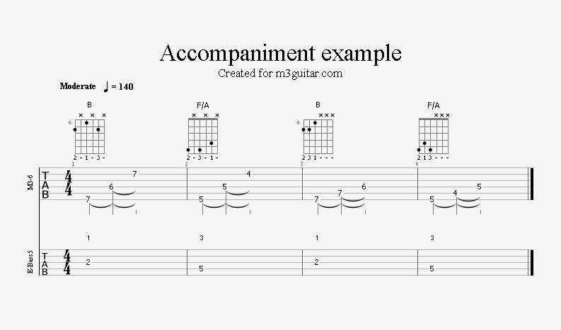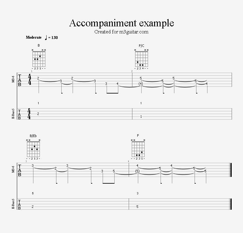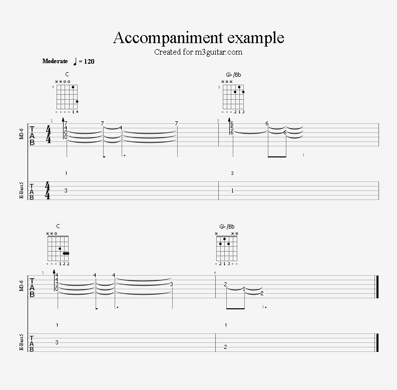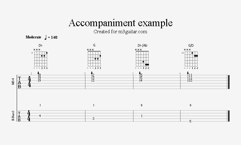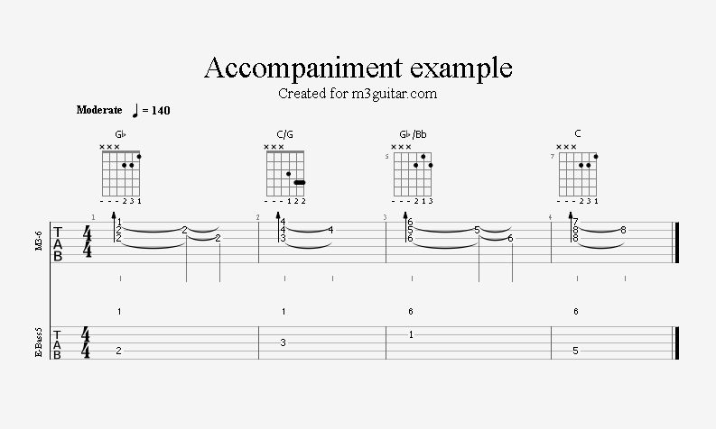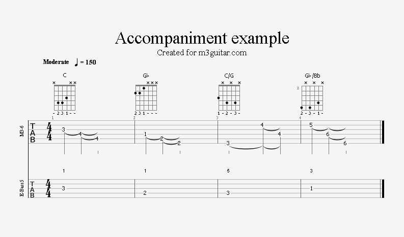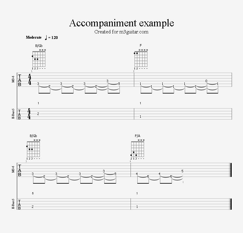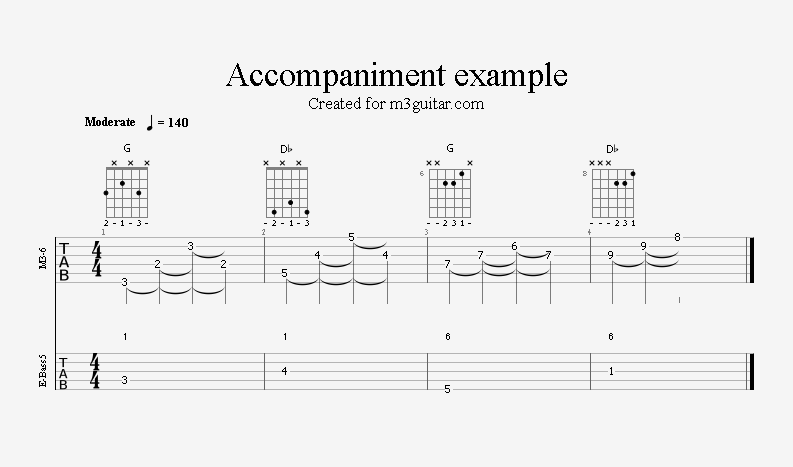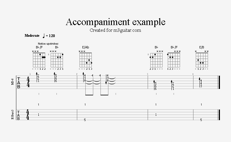 There are 24 examples, with two in each of the twelve keys. The examples are ordered in pairs since it does not make any difference whether the root movement goes up or down by six semitones, you end up on the same note. Each pair is denoted by a number corresponding to the starting key in clock notation. Thus, the first pair of examples, 1, starts in A (1 in clock notation), and moves up five semitones to D. A bass line is included, using notes from the triads (1-3-5) and occasionally the 6th, which makes a minor 7 sound. The function of each bass note is indicated as a number (1, 3, 5, or 6) above the staff. All examples are in 4/4 and consist of four bars, repeating the two chords once. Thus, the triads making up the 1 examples are A-Eb-A-Eb. All examples can be played with a pick only, without having to pluck the strings with the right hand fingers.